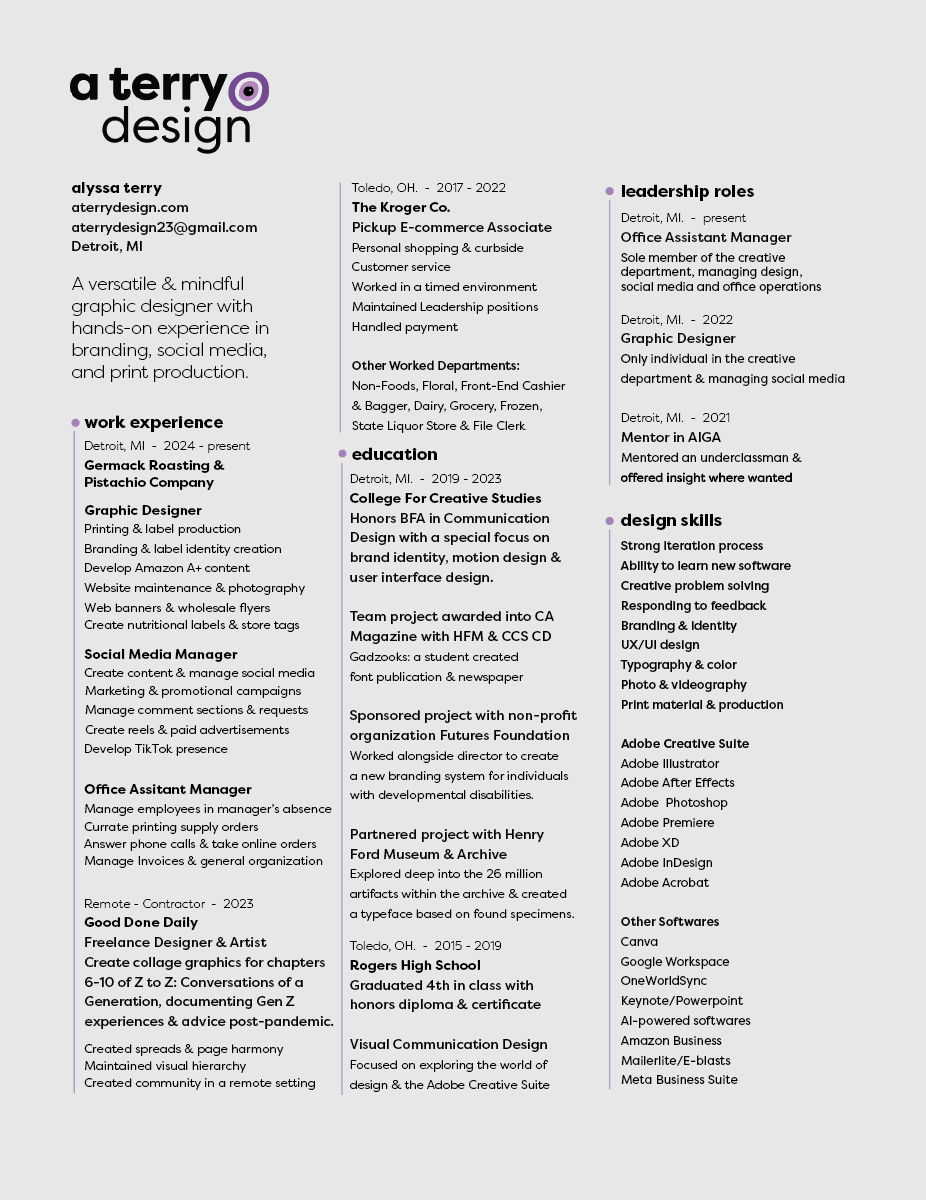 Post-graduation, I contracted with my former professor from CCS at his company, Good Done Daily. Within a team, we worked hard on an exciting book project, infusing it with our collective passion for creativity and impact. Currently, I am working as a graphic designer & office assistant for Germack Roasting Co. & Germack Pistatchio Co. Aside from my technical skills, I bring a unique blend of creativity and mindfulness to everything I do. Whether I’m sketching out ideas, creating mood boards, or refining branding identities, I approach each project with intention and consciousness.